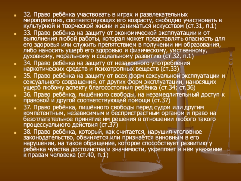 36. Право ребёнка, лишённого свободы, на незамедлительный доступ к правовой и другой соответствующей помощи (ст.37)