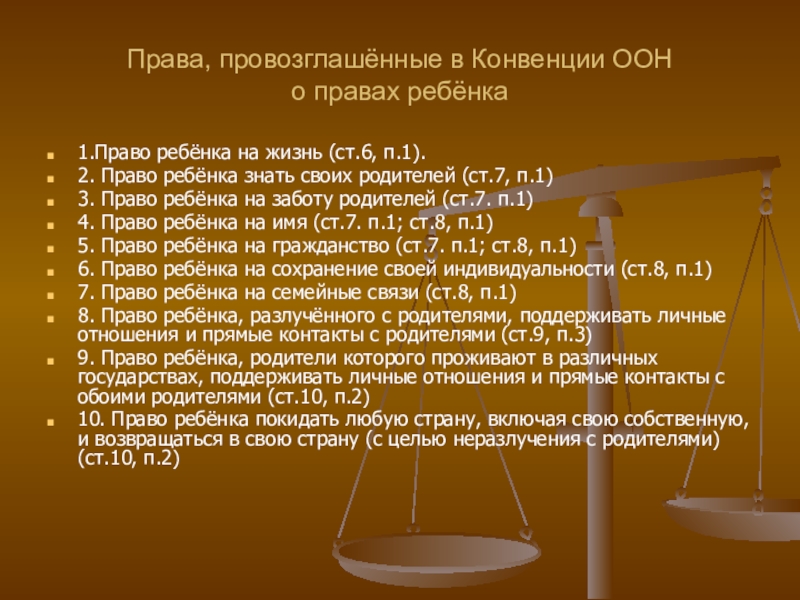9. Право ребёнка, родители которого проживают в различных государствах, поддерживать личные отношения и прямые контакты с обоими родителями (ст.10, п.2)