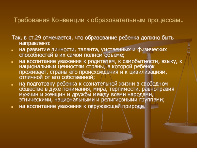 на подготовку ребенка к сознательной жизни в свободном обществе в духе понимания, мира, терпимости, равноправия мужчин и женщин и дружбы между всеми народами, этническими, национальными и религиозными группами;
