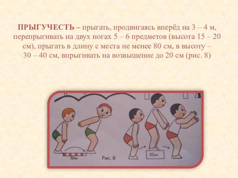 на двух ногах 5 – 6 предметов (высота 15 – 20 см), прыгать в длину с места не менее 80 см, в высоту – 30 – 40 см, впрыгивать на возвышение до 20 см (рис. 8)