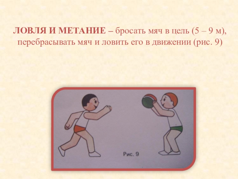 Слайд 10ЛОВЛЯ И МЕТАНИЕ – бросать мяч в цель (5 – 9