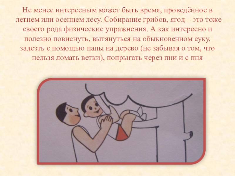 лесу. Собирание грибов, ягод – это тоже своего рода физические упражнения. А как интересно и полезно повиснуть, вытянуться на обыкновенном суку, залезть с помощью папы на дерево (не забывая о том, что нельзя ломать ветки), попрыгать через пни и с пня
