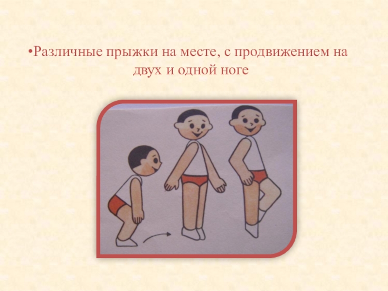 Слайд 5Различные прыжки на месте, с продвижением на двух и одной ноге