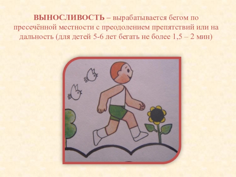 ВЫНОСЛИВОСТЬ – вырабатывается бегом по пресечённой местности с преодолением препятствий или на дальность (для детей 5-6 лет