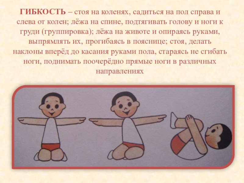 Слайд 8ГИБКОСТЬ – стоя на коленях, садиться на пол справа и слева
