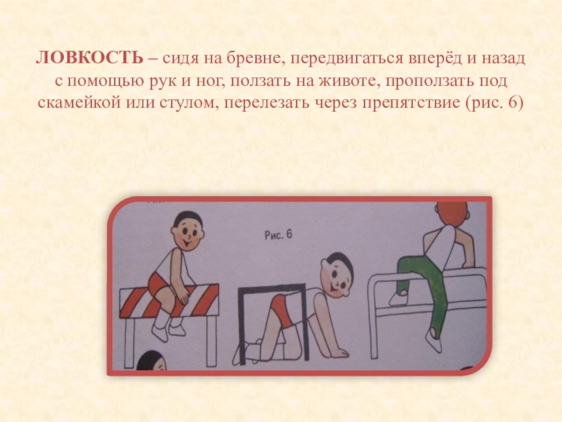 ЛОВКОСТЬ – сидя на бревне, передвигаться вперёд и назад с помощью рук и ног, ползать на животе,