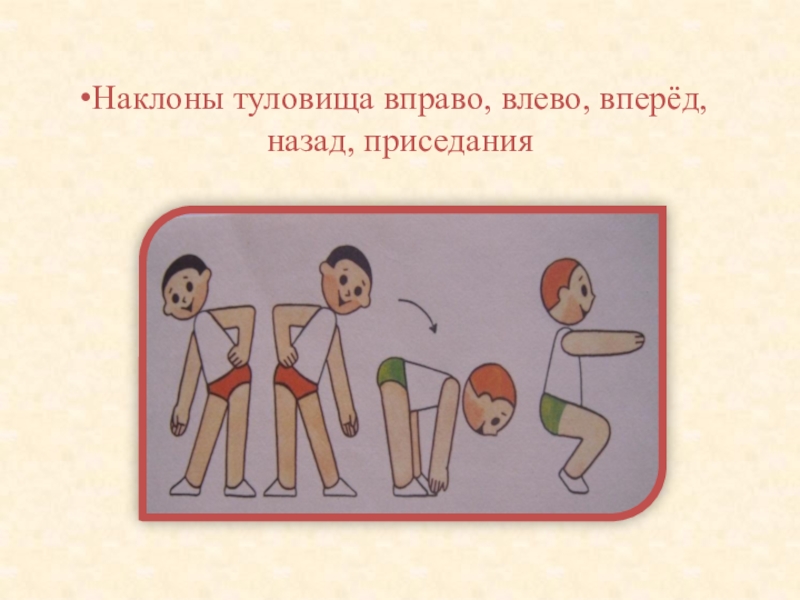 Слайд 4Наклоны туловища вправо, влево, вперёд, назад, приседания