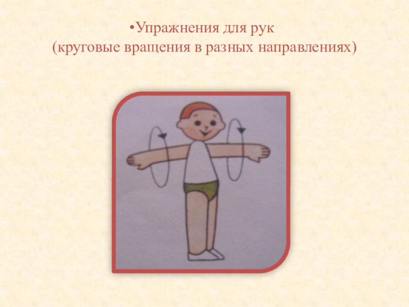 Слайд 3Упражнения для рук (круговые вращения в разных направлениях)