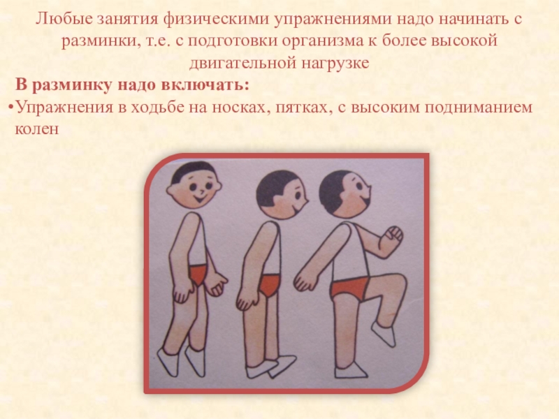 Любые занятия физическими упражнениями надо начинать с разминки, т.е. с подготовки организма к более высокой двигательной нагрузкеВ разминку надо включать:Упражнения в ходьбе на носках, пятках, с высоким подниманием колен
