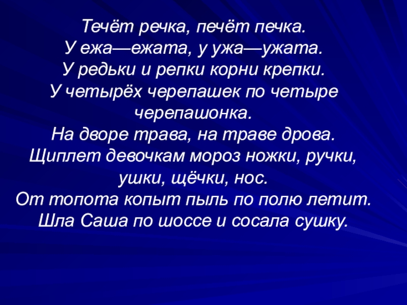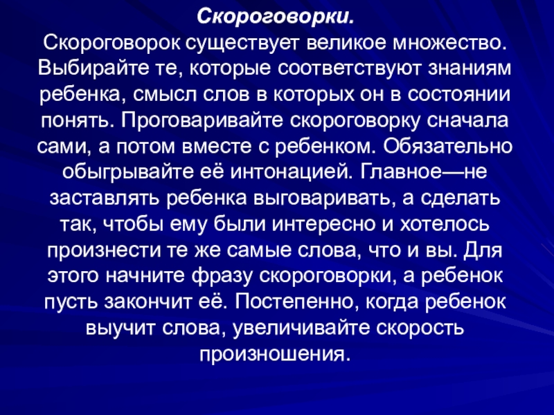 слов в которых он в состоянии понять. Проговаривайте скороговорку сначала сами, а потом вместе с ребенком. Обязательно обыгрывайте её интонацией. Главное—не заставлять ребенка выговаривать, а сделать так, чтобы ему были интересно и хотелось произнести те же самые слова, что и вы. Для этого начните фразу скороговорки, а ребенок пусть закончит её. Постепенно, когда ребенок выучит слова, увеличивайте скорость произношения.