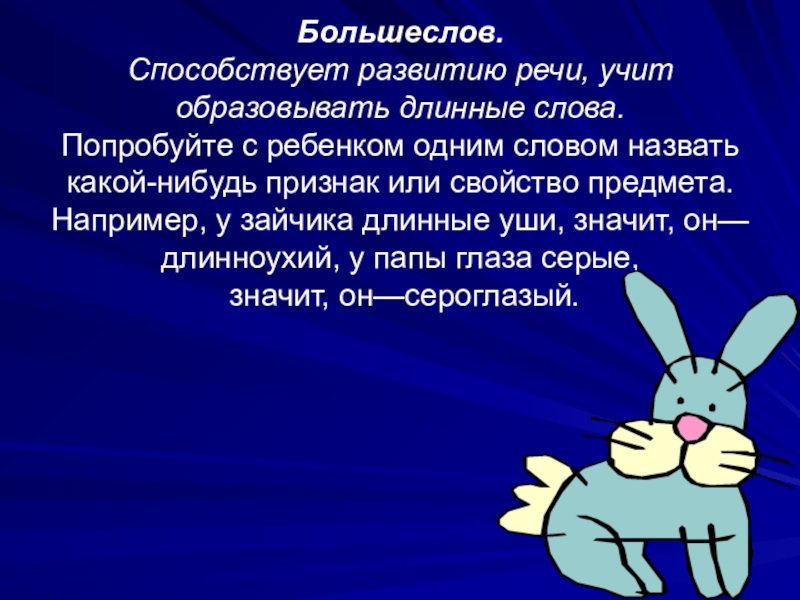 назвать какой-нибудь признак или свойство предмета. Например, у зайчика длинные уши, значит, он—длинноухий, у папы глаза серые,