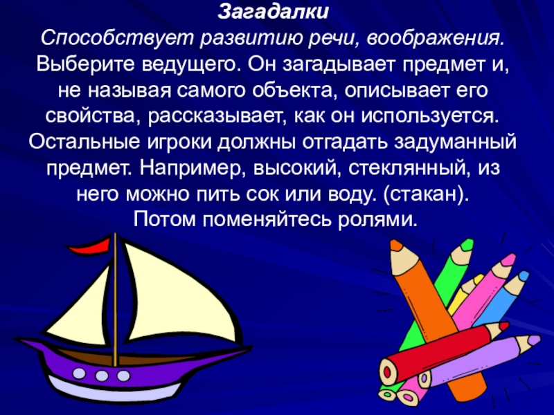 самого объекта, описывает его свойства, рассказывает, как он используется. Остальные игроки должны отгадать задуманный предмет. Например, высокий, стеклянный, из него можно пить сок или воду. (стакан).
