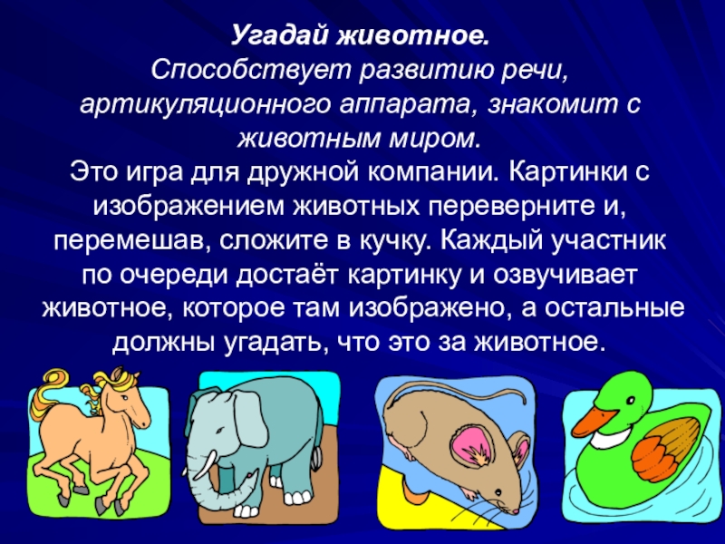 для дружной компании. Картинки с изображением животных переверните и, перемешав, сложите в кучку. Каждый участник по очереди достаёт картинку и озвучивает животное, которое там изображено, а остальные должны угадать, что это за животное.