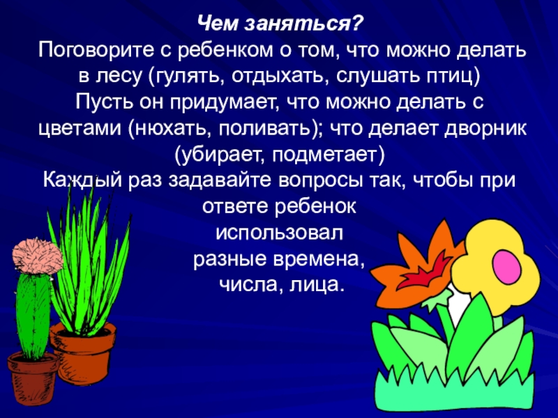 Пусть он придумает, что можно делать с цветами (нюхать, поливать); что делает дворник (убирает, подметает)