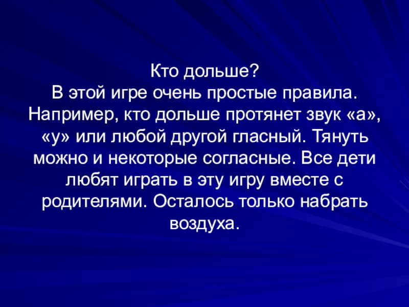 звук «а», «у» или любой другой гласный. Тянуть можно и некоторые согласные. Все дети любят играть в эту игру вместе с родителями. Осталось только набрать воздуха.