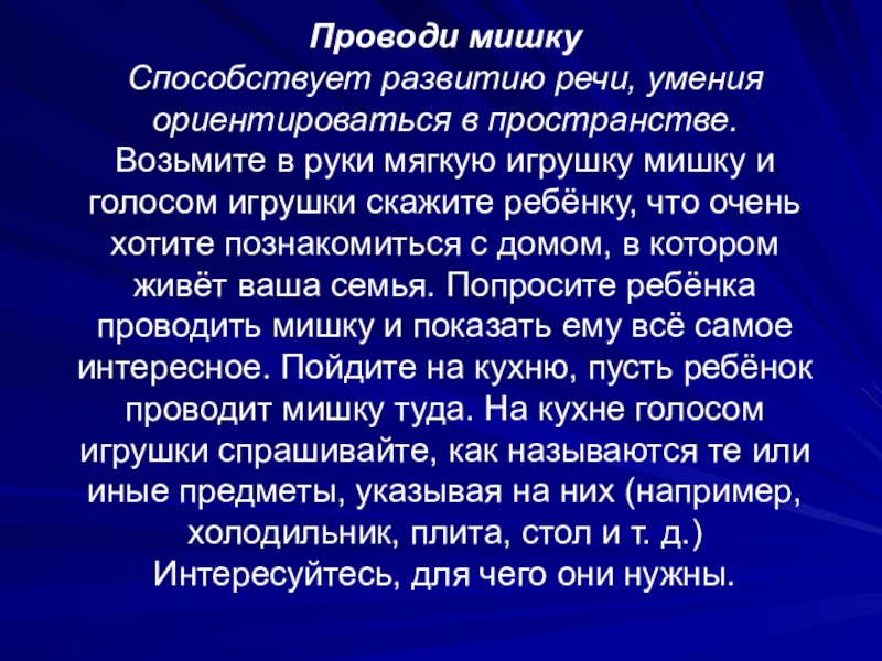игрушку мишку и голосом игрушки скажите ребёнку, что очень хотите познакомиться с домом, в котором живёт ваша семья. Попросите ребёнка проводить мишку и показать ему всё самое интересное. Пойдите на кухню, пусть ребёнок проводит мишку туда. На кухне голосом игрушки спрашивайте, как называются те или иные предметы, указывая на них (например, холодильник, плита, стол и т. д.) Интересуйтесь, для чего они нужны.