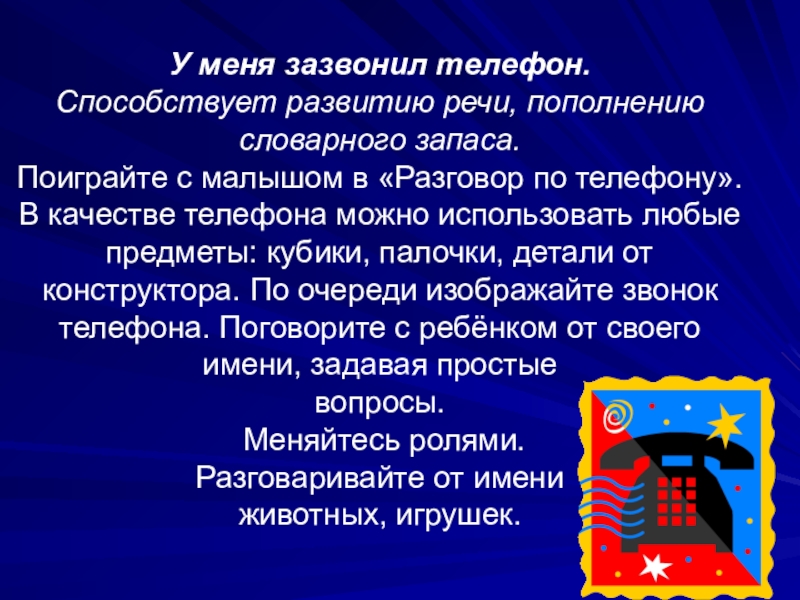 в «Разговор по телефону». В качестве телефона можно использовать любые предметы: кубики, палочки, детали от конструктора. По очереди изображайте звонок телефона. Поговорите с ребёнком от своего имени, задавая простые