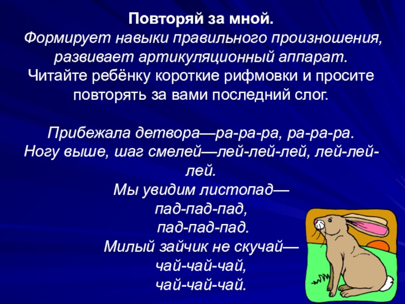 Предложите ребёнку повторять за вами рифмованные строчки:
