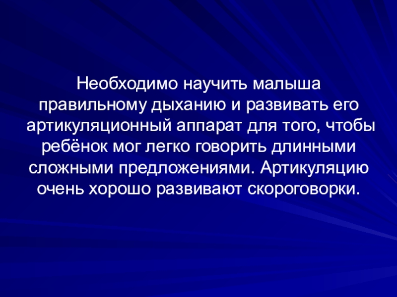 Слайд 5Необходимо научить малыша правильному дыханию и развивать его артикуляционный аппарат для