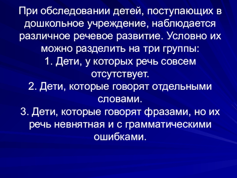 Слайд 3При обследовании детей, поступающих в дошкольное учреждение, наблюдается различное речевое развитие.