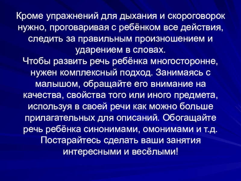 Слайд 7Кроме упражнений для дыхания и скороговорок нужно, проговаривая с ребёнком все