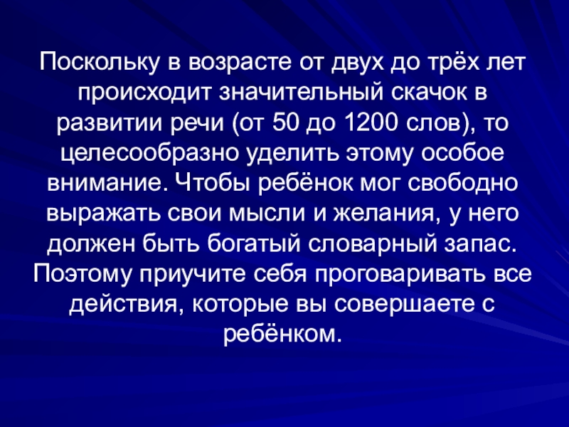 в развитии речи (от 50 до 1200 слов), то целесообразно уделить этому особое внимание. Чтобы ребёнок мог свободно выражать свои мысли и желания, у него должен быть богатый словарный запас. Поэтому приучите себя проговаривать все действия, которые вы совершаете с ребёнком.