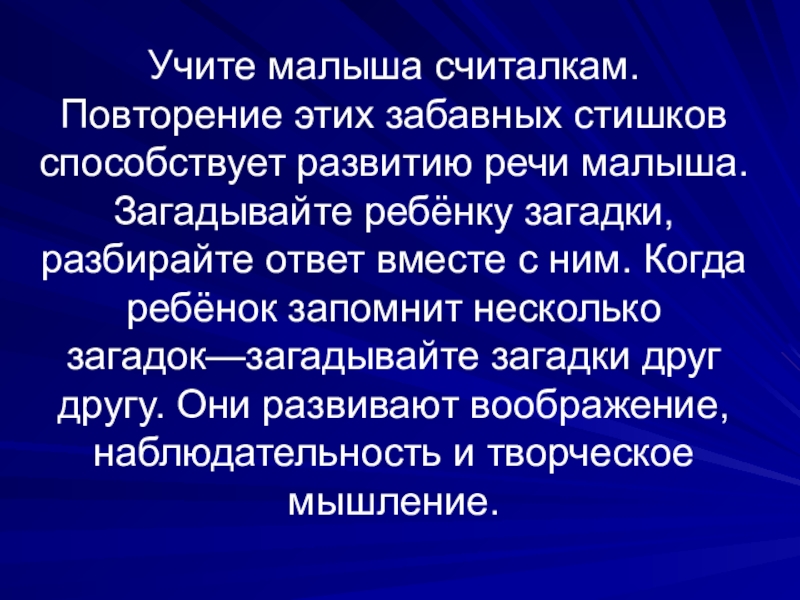Слайд 6Учите малыша считалкам. Повторение этих забавных стишков способствует развитию речи малыша.