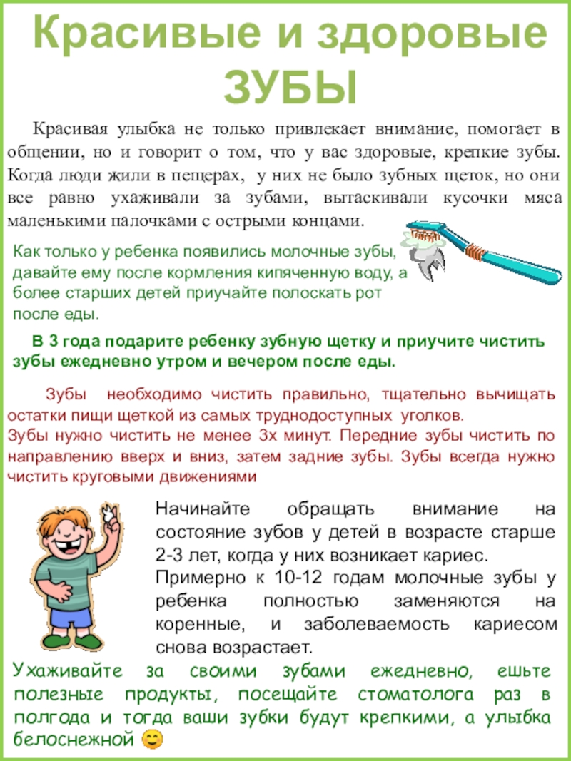 Зубы нужно чистить не менее 3х минут. Передние зубы чистить по направлению вверх и вниз, затем задние зубы. Зубы всегда нужно чистить круговыми движениями