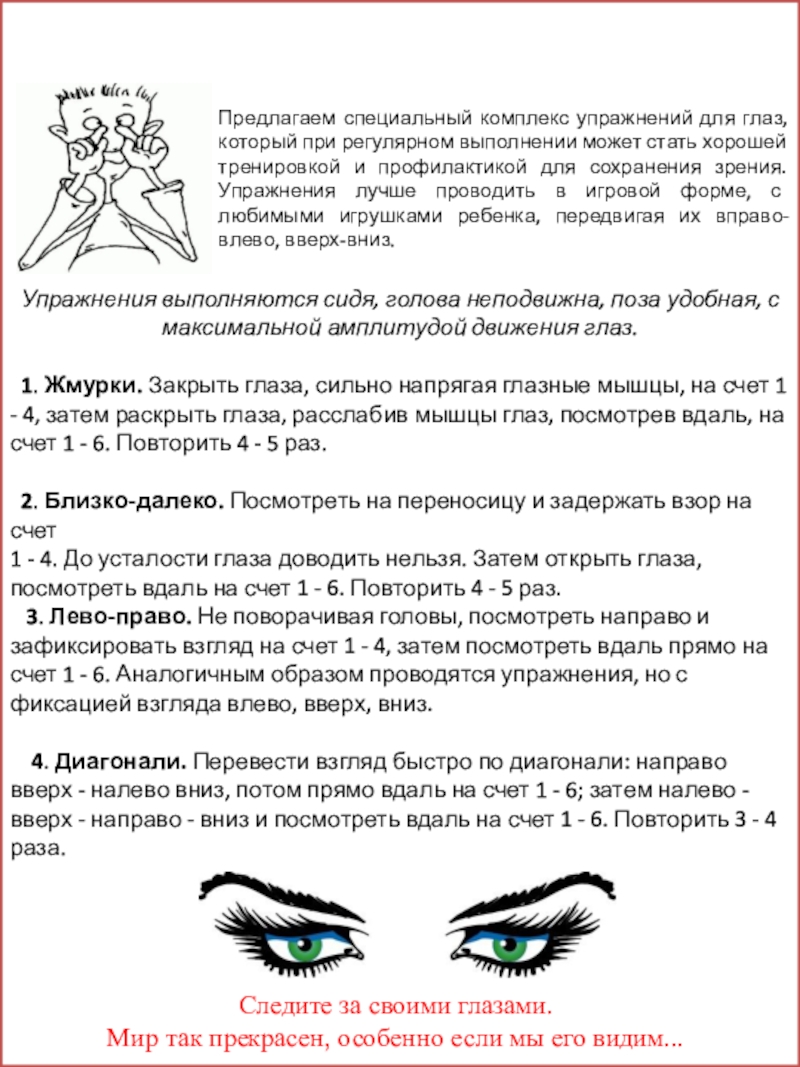1. Жмурки. Закрыть глаза, сильно напрягая глазные мышцы, на счет 1 - 4, затем раскрыть глаза, расслабив мышцы глаз, посмотрев вдаль, на счет 1 - 6. Повторить 4 - 5 раз.