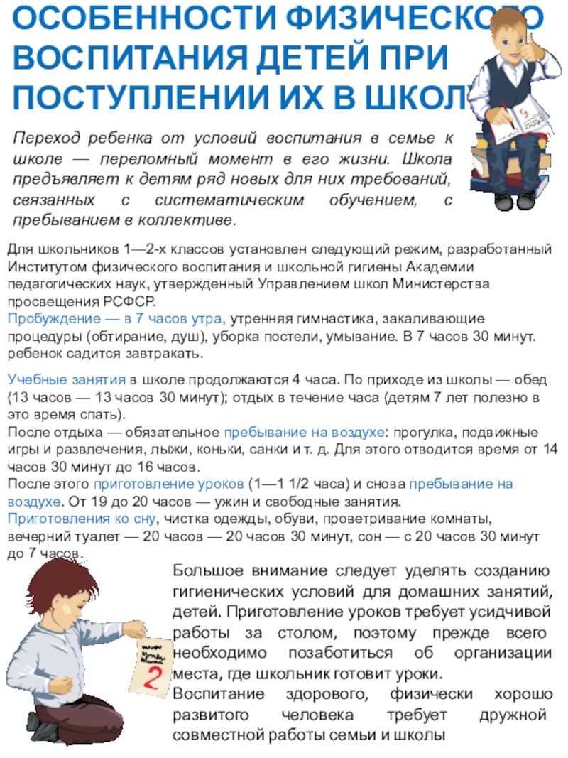 Для школьников 1—2-х классов установлен следующий режим, разработанный Институтом физического воспитания и школьной гигиены Академии педагогических наук, утвержденный Управлением школ Министерства просвещения РСФСР.