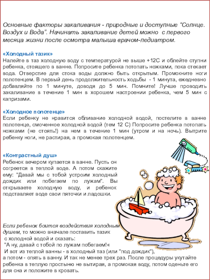 Основные факторы закаливания - природные и доступные “Солнце. Воздух и Вода”. Начинать закаливание детей можно с первого месяца жизни после осмотра малыша врачом-педиатром.