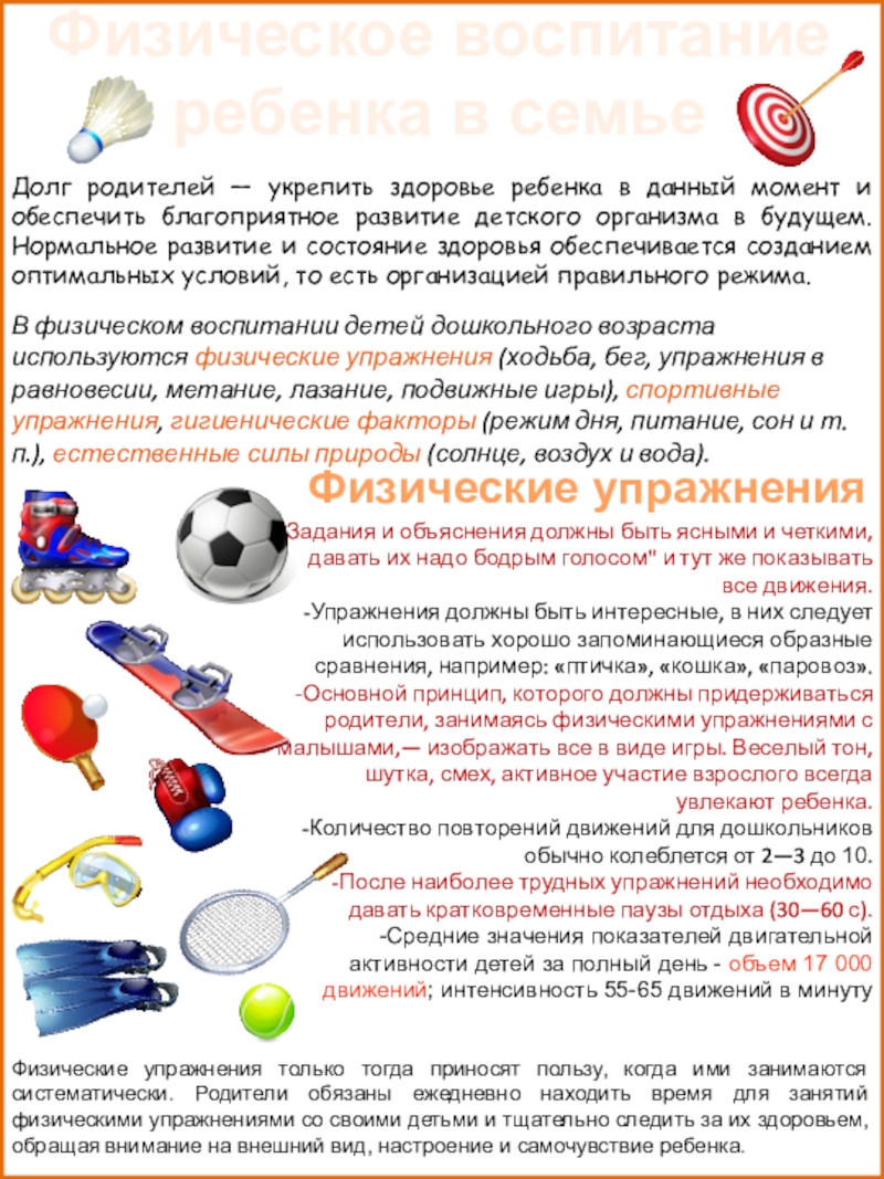 Физические упражнения только тогда приносят пользу, когда ими занимаются систематически. Родители обязаны ежедневно находить время для занятий физическими упражнениями со своими детьми и тщательно следить за их здоровьем, обращая внимание на внешний вид, настроение и самочувствие ребенка.