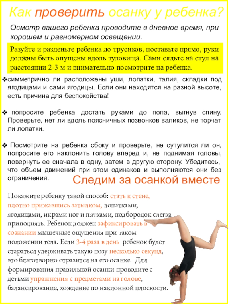 Контролируйте осанку своего ребенка раз в пол года самостоятельно, не прибегая к помощи врача.