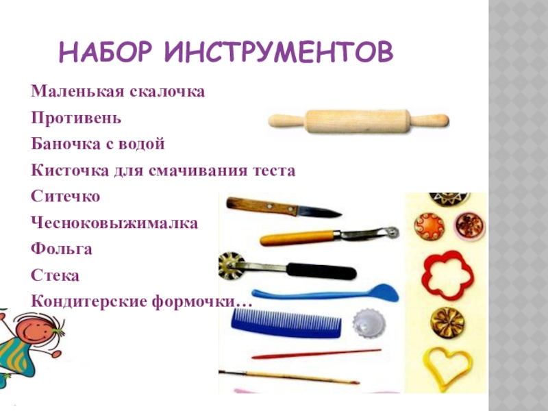 Набор инструментовМаленькая скалочкаПротивеньБаночка с водойКисточка для смачивания тестаСитечкоЧесноковыжималкаФольгаСтекаКондитерские формочки…