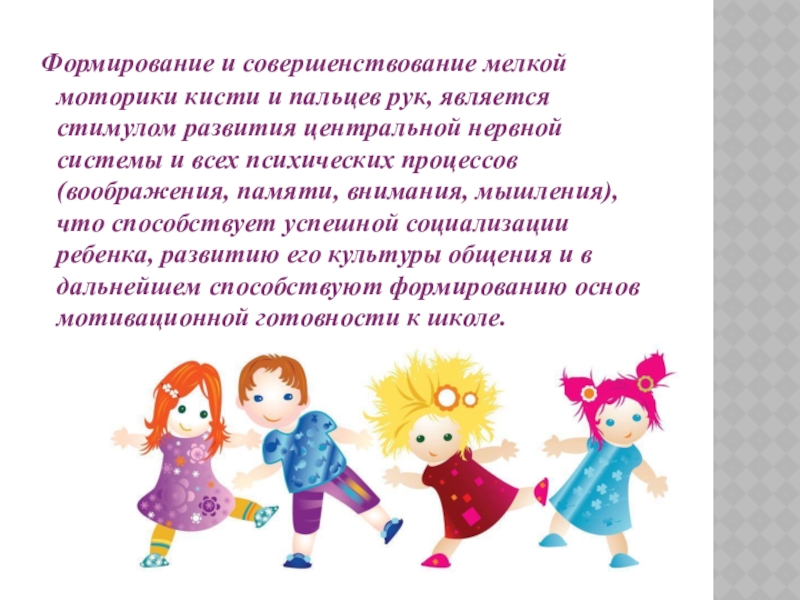 Формирование и совершенствование мелкой моторики кисти и пальцев рук, является стимулом развития центральной нервной системы и