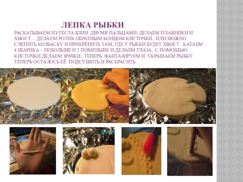 Лепка рыбки Раскатываем из теста блин двумя пальцами делаем плавники и хвост . Делаем ротик обратным концом кисточки, или можно слепить колбаску и прикрепить там, где у рыбки будет хвост . Катаем 4 шарика – побольше и 2 поменьше и делаем глаза. С помощью кисточки делаем зрачки. Теперь фантазируем и украшаем рыбку. Теперь осталось её подсушить и раскрасить.