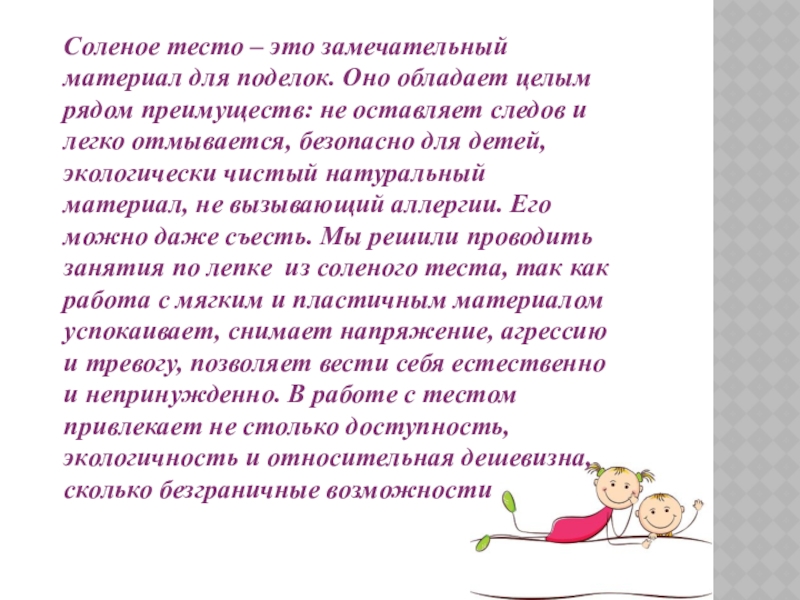 рядом преимуществ: не оставляет следов и легко отмывается, безопасно для детей, экологически чистый натуральный материал, не вызывающий аллергии. Его можно даже съесть. Мы решили проводить занятия по лепке из соленого теста, так как работа с мягким и пластичным материалом успокаивает, снимает напряжение, агрессию и тревогу, позволяет вести себя естественно и непринужденно. В работе с тестом привлекает не столько доступность, экологичность и относительная дешевизна, сколько безграничные возможности