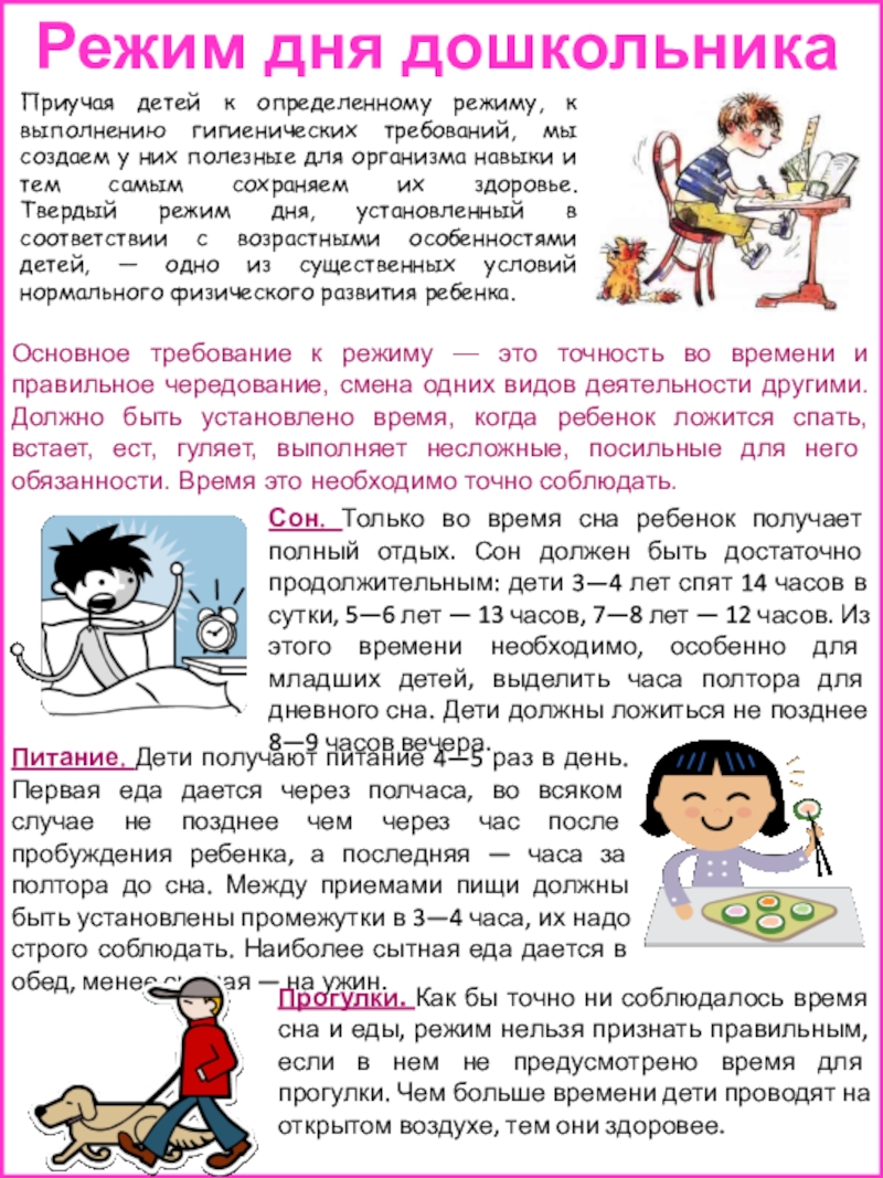 Основное требование к режиму — это точность во времени и правильное чередование, смена одних видов деятельности другими.