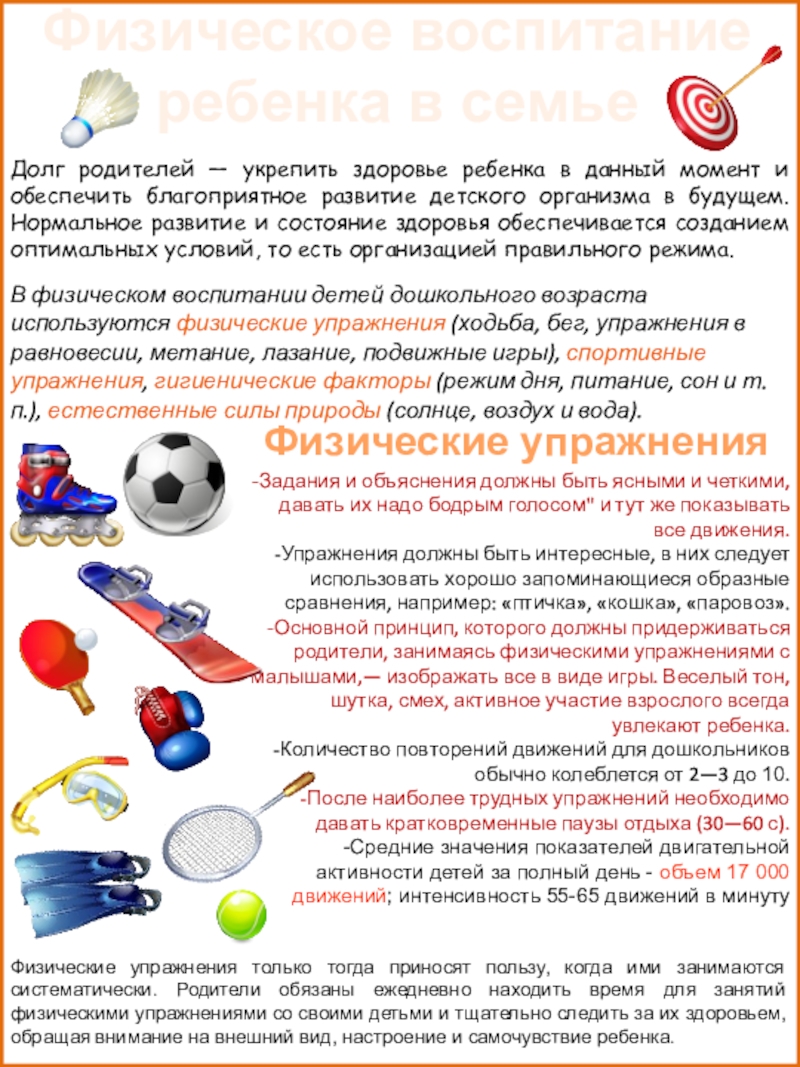 Физические упражнения только тогда приносят пользу, когда ими занимаются систематически. Родители обязаны ежедневно находить время для занятий физическими упражнениями со своими детьми и тщательно следить за их здоровьем, обращая внимание на внешний вид, настроение и самочувствие ребенка.