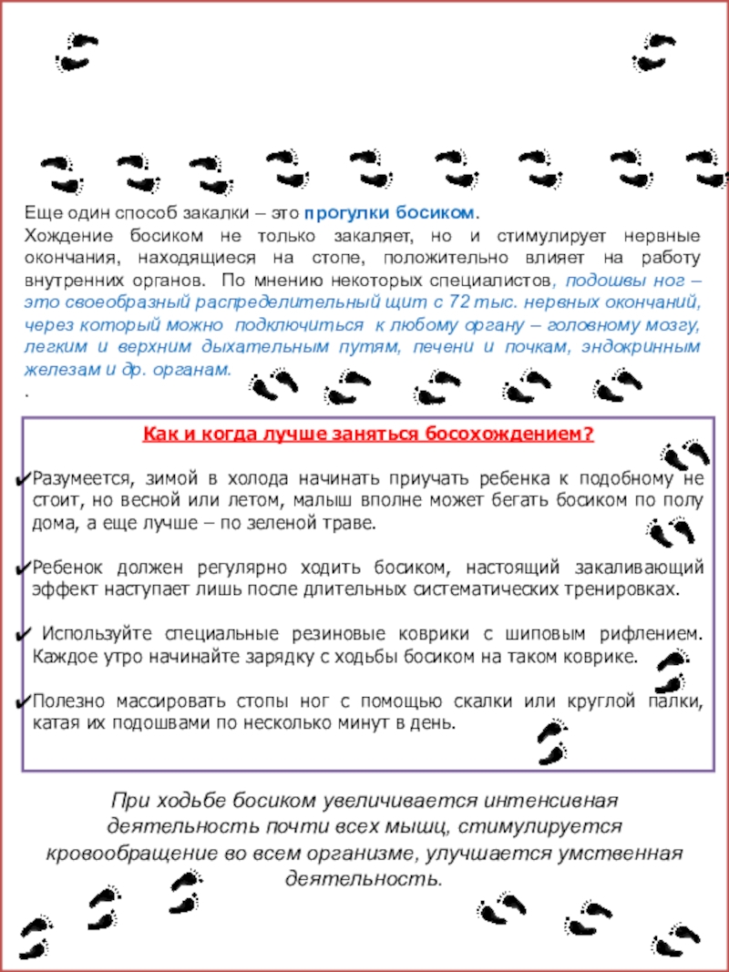 Хождение босиком не только закаляет, но и стимулирует нервные окончания, находящиеся на стопе, положительно влияет на работу внутренних органов. По мнению некоторых специалистов, подошвы ног – это своеобразный распределительный щит с 72 тыс. нервных окончаний, через который можно подключиться к любому органу – головному мозгу, легким и верхним дыхательным путям, печени и почкам, эндокринным железам и др. органам.