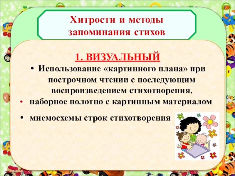 В подготовительной к школе группе используется ещё и логический метод заучивания стихотворения: