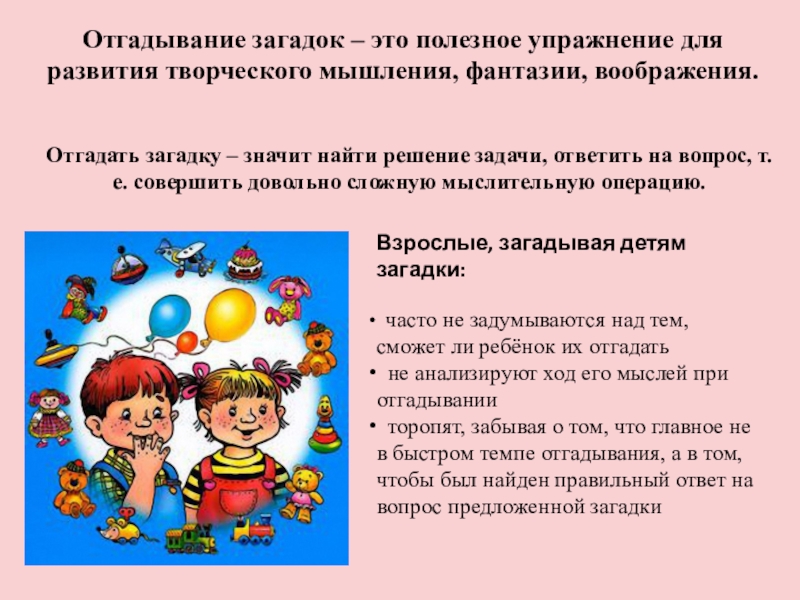 Отгадывание загадок – это полезное упражнение для развития творческого мышления, фантазии, воображения.