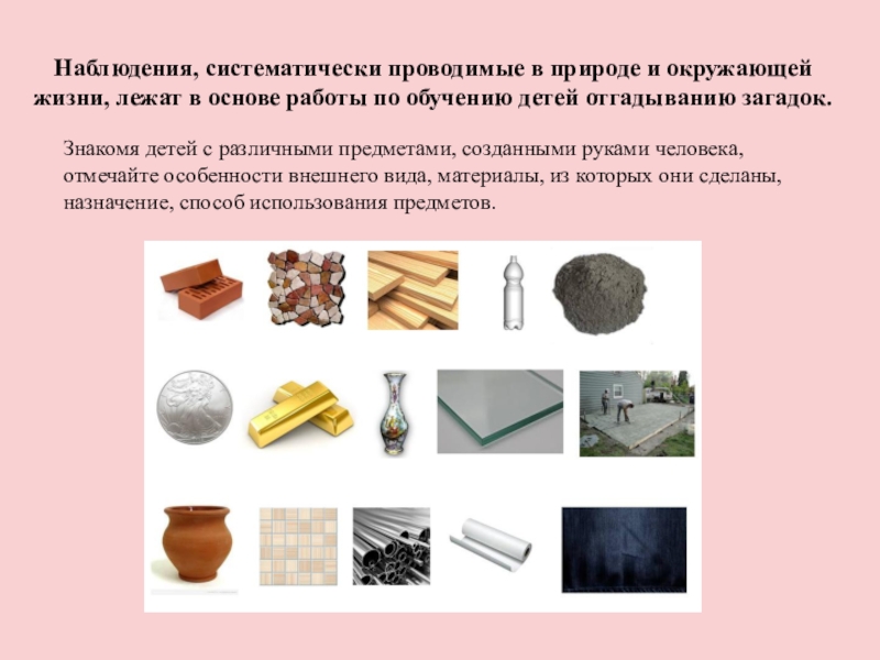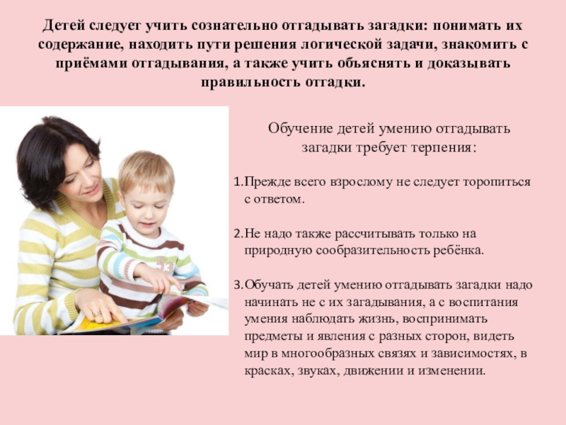 Обучать детей умению отгадывать загадки надо начинать не с их загадывания, а с воспитания умения наблюдать жизнь, воспринимать предметы и явления с разных сторон, видеть мир в многообразных связях и зависимостях, в красках, звуках, движении и изменении.