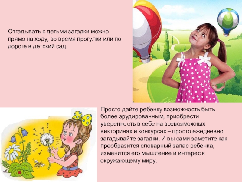 Просто дайте ребенку возможность быть более эрудированным, приобрести уверенность в себе на всевозможных викторинах и конкурсах – просто ежедневно загадывайте загадки. И вы сами заметите как преобразится словарный запас ребенка, изменится его мышление и интерес к окружающему миру.