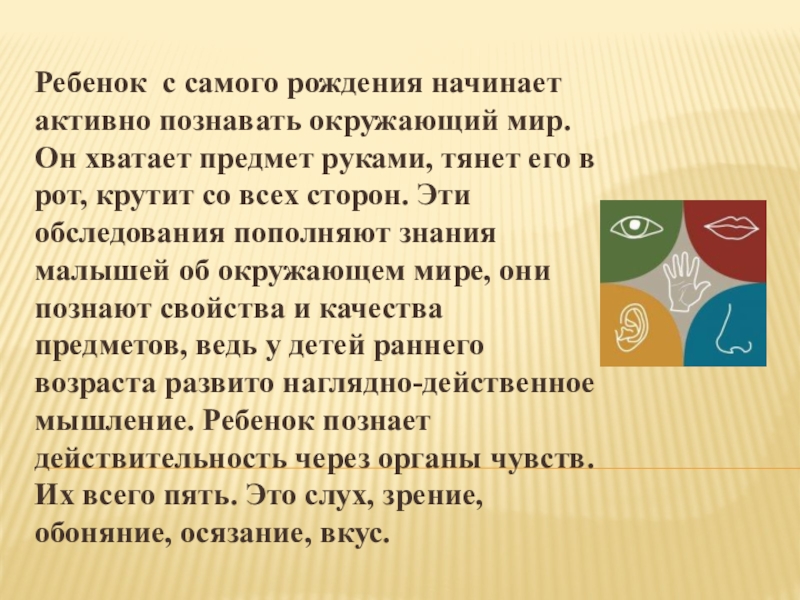 предмет руками, тянет его в рот, крутит со всех сторон. Эти обследования пополняют знания малышей об окружающем мире, они познают свойства и качества предметов, ведь у детей раннего возраста развито наглядно-действенное мышление. Ребенок познает действительность через органы чувств. Их всего пять. Это слух, зрение, обоняние, осязание, вкус.