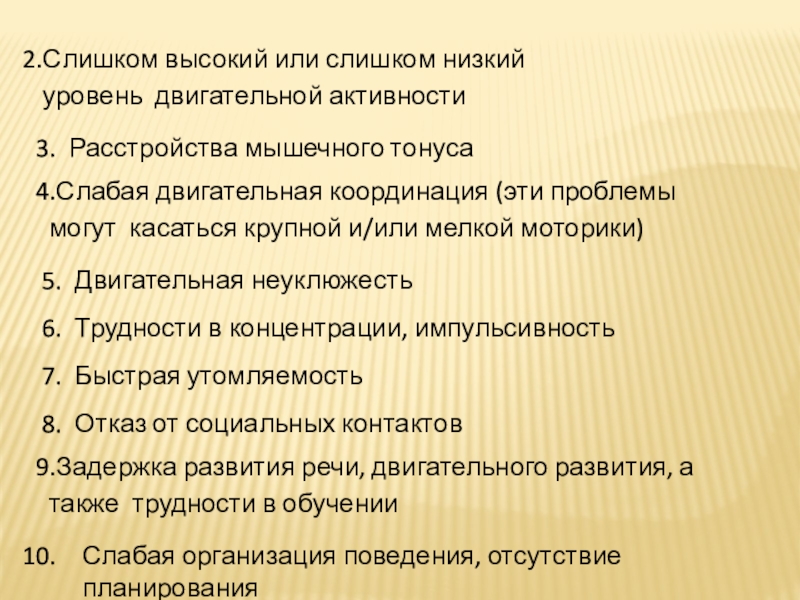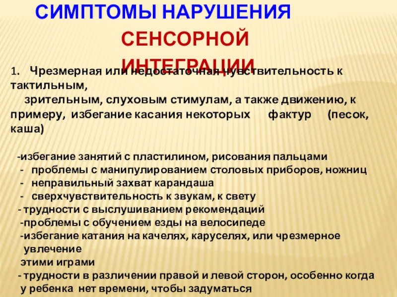 Слайд 6Симптомы нарушения сенсорной интеграции