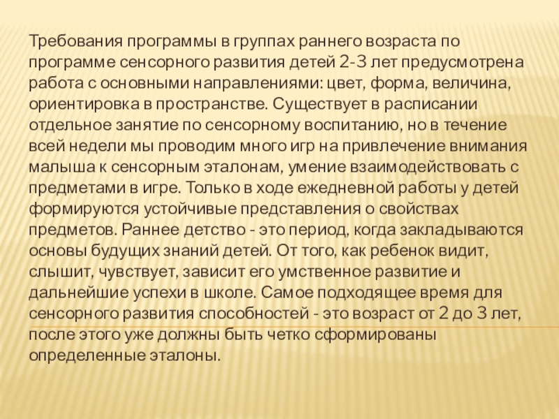 2-3 лет предусмотрена работа с основными направлениями: цвет, форма, величина, ориентировка в пространстве. Существует в расписании отдельное занятие по сенсорному воспитанию, но в течение всей недели мы проводим много игр на привлечение внимания малыша к сенсорным эталонам, умение взаимодействовать с предметами в игре. Только в ходе ежедневной работы у детей формируются устойчивые представления о свойствах предметов. Раннее детство - это период, когда закладываются основы будущих знаний детей. От того, как ребенок видит, слышит, чувствует, зависит его умственное развитие и дальнейшие успехи в школе. Самое подходящее время для сенсорного развития способностей - это возраст от 2 до 3 лет, после этого уже должны быть четко сформированы определенные эталоны.