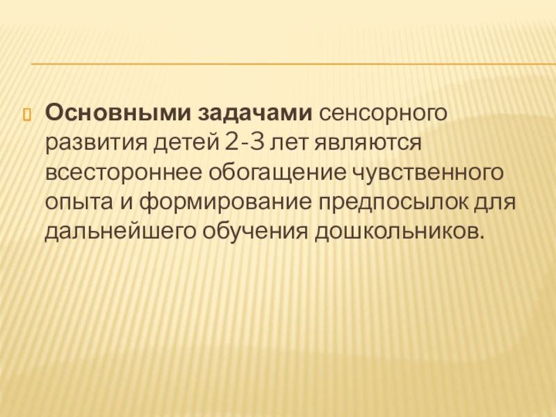 Слайд 20Основными задачами сенсорного развития детей 2-3 лет являются всестороннее обогащение чувственного