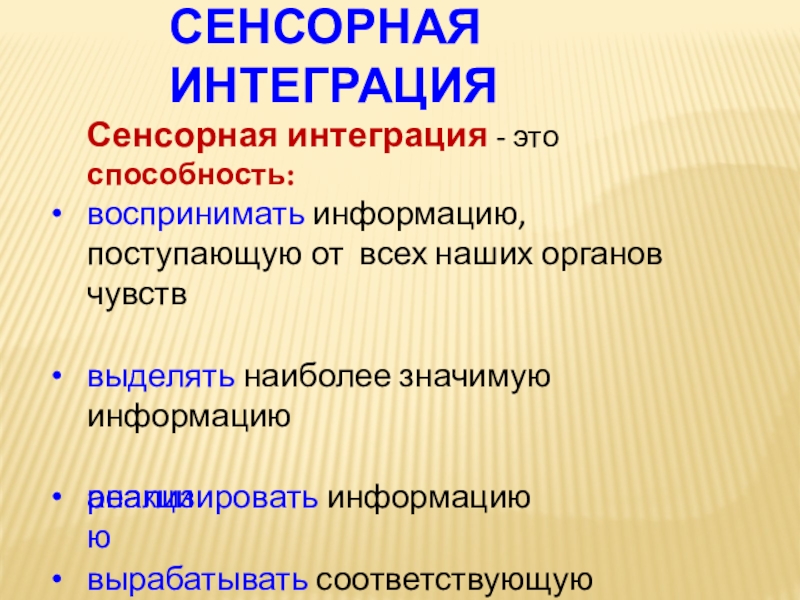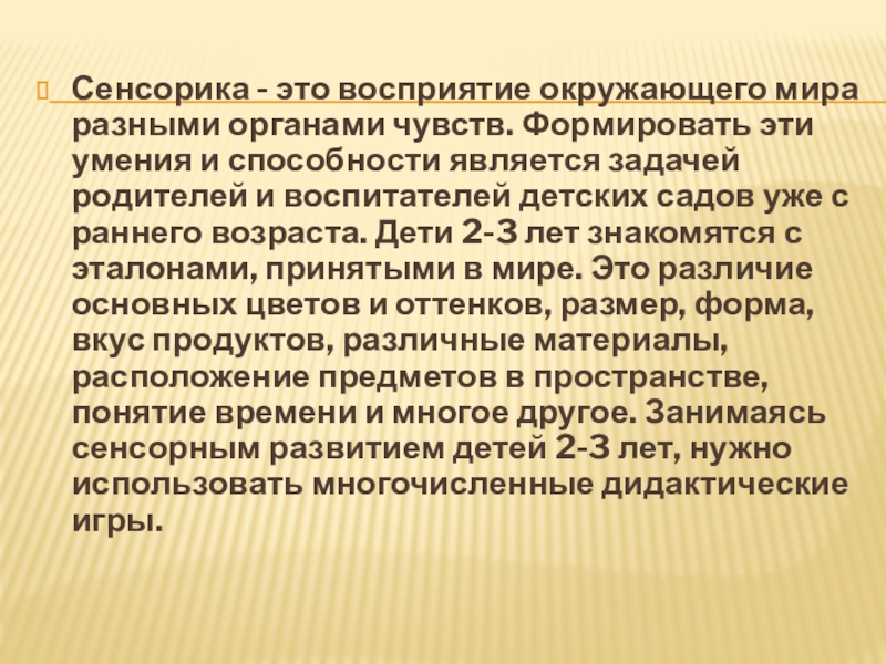Слайд 4Сенсорика - это восприятие окружающего мира разными органами чувств. Формировать эти