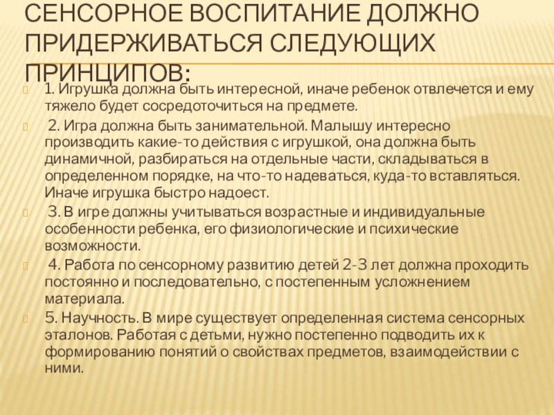 Слайд 22Сенсорное воспитание должно придерживаться следующих принципов: